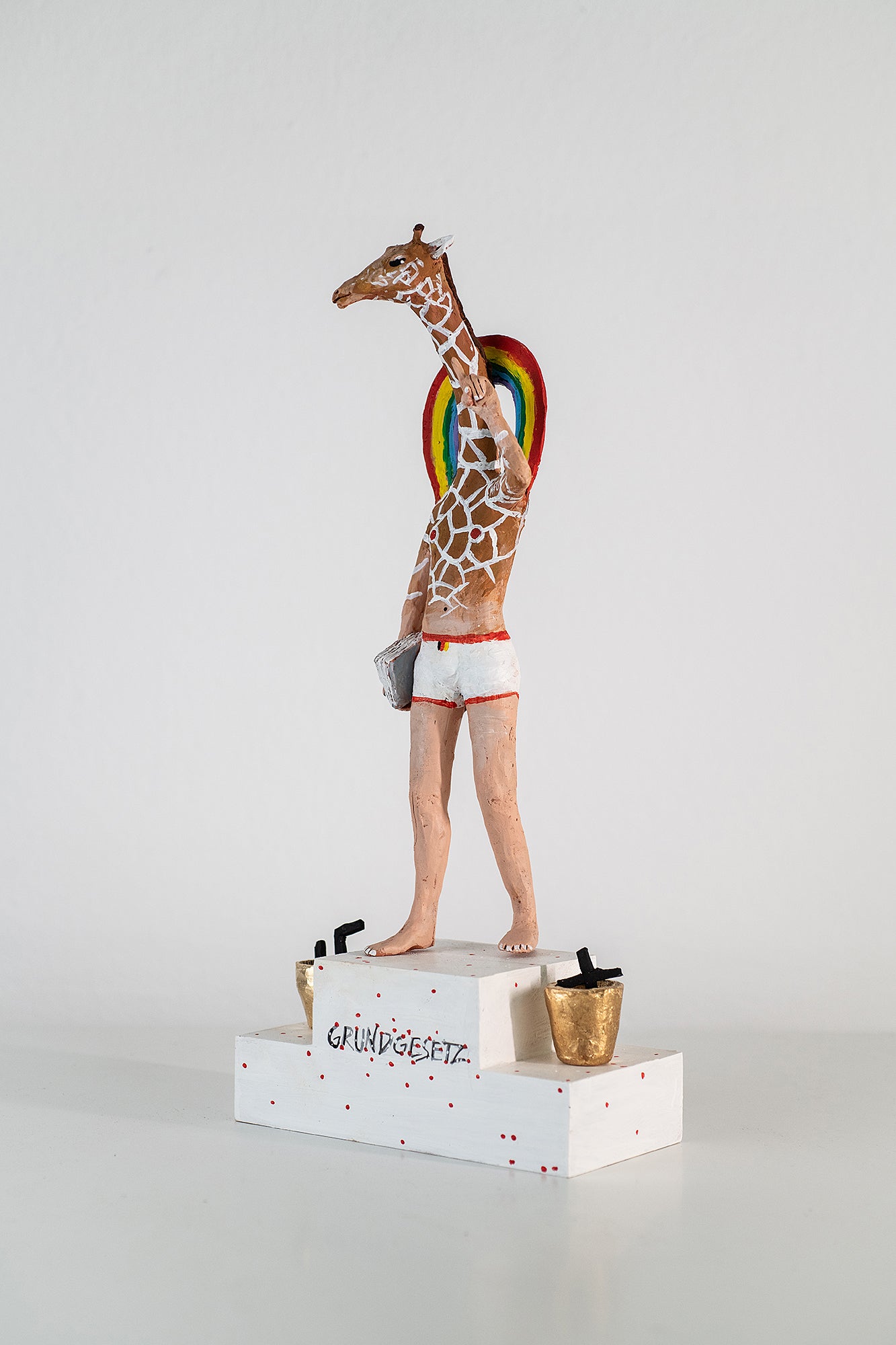 All "Bundesgiraffen" are made from clay and are hand-painted. They all sit solid on a wooden Grundgesetz-plinth.